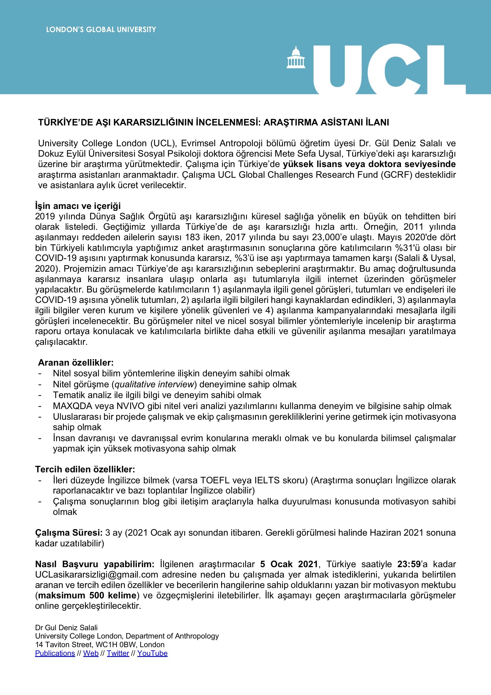 University College London (UCL), Evrimsel Antropoloji bölümü öğretim üyesi Dr. Gül Deniz Salalı ve Dokuz Eylül Üniversitesi Sosyal Psikoloji doktora öğrencisi Mete Sefa Uysal, Türkiye’deki aşı kararsızlığı üzerine bir araştırma yürütmektedir. Çalışma için Türkiye’de yüksek lisans veya doktora seviyesinde araştırma asistanları aranmaktadır. Çalışma UCL Global Challenges Research Fund (GCRF) desteklidir ve asistanlara aylık ücret verilecektir.