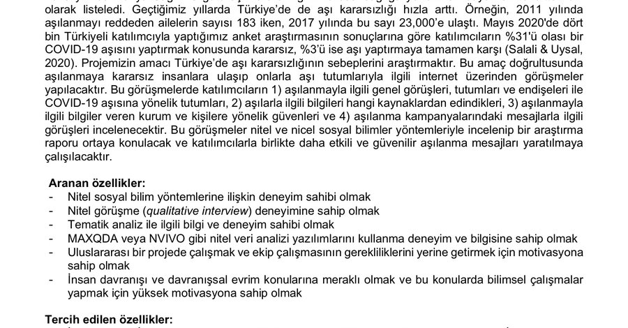 Nasıl Başvuru yapabilirim: İlgilenen araştırmacılar 5 Ocak 2021, Türkiye saatiyle 23:59’a kadar [email protected] adresine neden bu çalışmada yer almak istediklerini, yukarıda belirtilen aranan ve tercih edilen özellikler ve becerilerin hangilerine sahip olduklarını yazan bir motivasyon mektubu (maksimum 500 kelime) ve özgeçmişlerini iletebilirler. İlk aşamayı geçen araştırmacılarla görüşmeler online gerçekleştirilecektir.