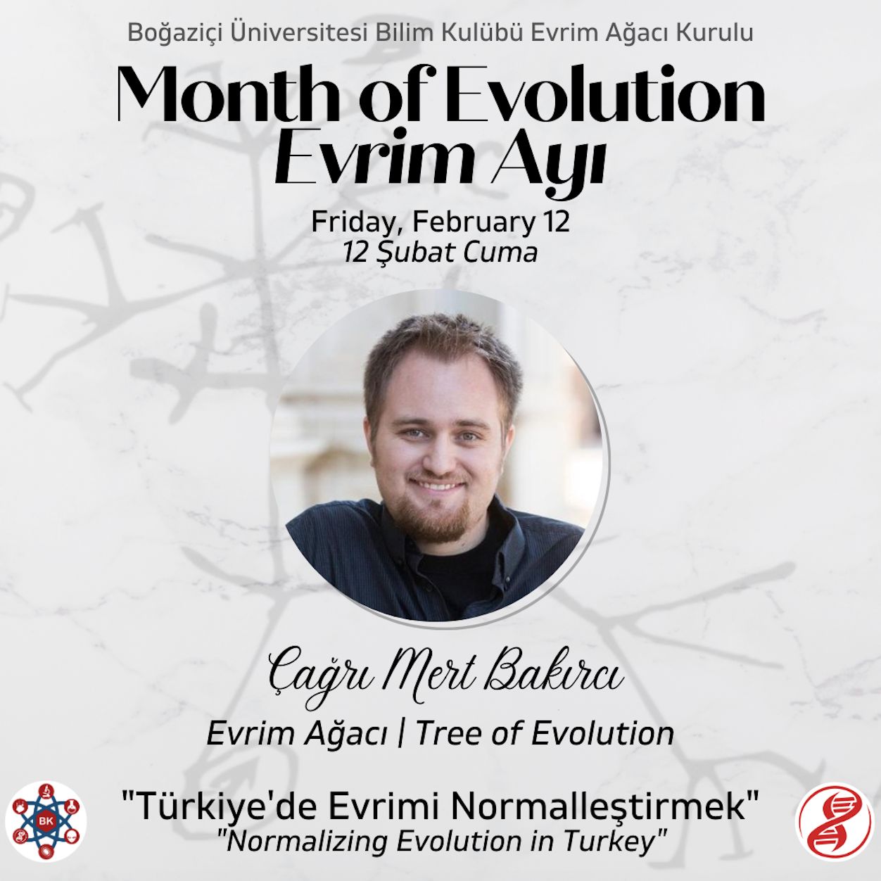 Evrim Ayı'nda Darwin Günü olan 12 Şubat'ta Çağrı Mert Bakırcı'nın "Türkiye'de Evrimi Normalleştirmek" adlı konuşmasıyla giriş yapacağız. Etkinlik YouTube'da canlı yayınlanacaktır. Evrim Ayı boyunca her oturuma ücretsiz olarak katılabilirsiniz. 12 Şubat Cuma 19.00'da Çağrı Mert Bakırcı ile olacak ilk etkinliğimizin linki aşağıdadır.