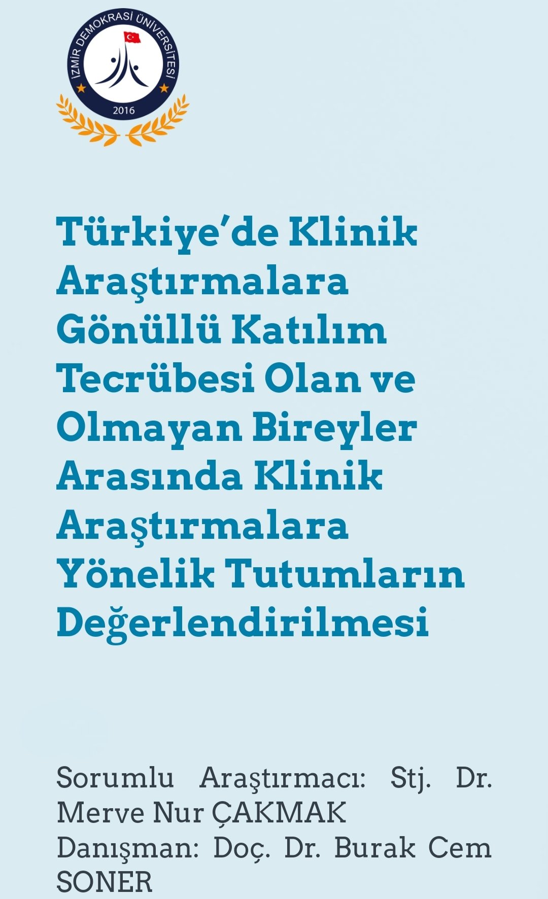 Merhaba, ben İzmir Demokrasi Üniversitesi Tıp Fakültesi 4.sınıf öğrencisi Merve Nur ÇAKMAK. TÜBİTAK desteğinde, üniversitesi etik kurul onaylı "Türkiye'de Klinik Araştırmalara Gönüllü Katılım Tecrübesi Olan ve Olmayan Bireyler Arasında Klinik Araştırmalara Yönelik Tutumların Değerlendirilmesi" konulu bir proje yürütüyorum. 5-6 dk'nizi ayırarak paylaştığım linkteki anketi doldurabilir ve 19 yaş ve üzeri paylaşabileceğiniz aile, arkadaş, wp grubu vs ile paylaşabilirseniz çok sevinirim, şimdiden teşekkür ederim🥰💕