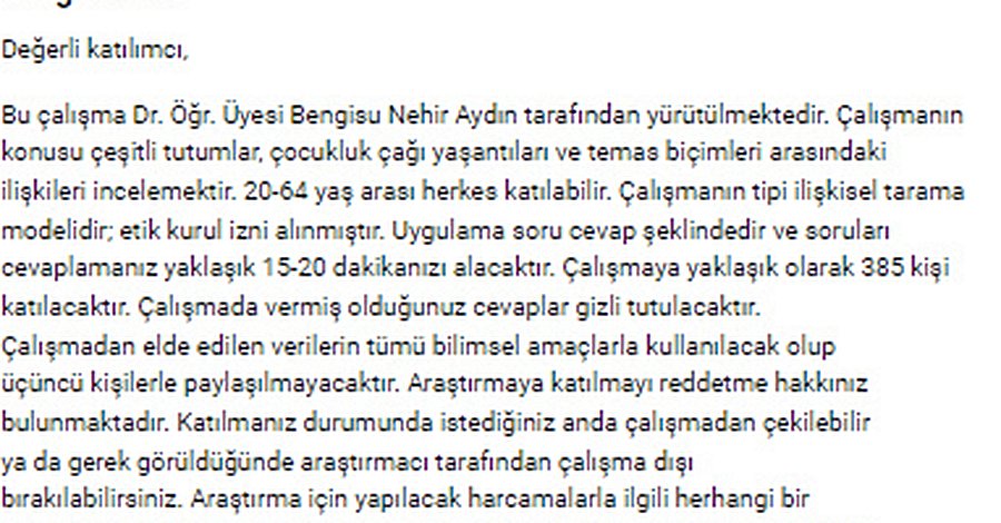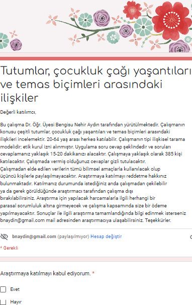 Dr. Öğr. Üyesi Bengisu Nehir Aydın tarafından yürütülen, şiddete yönelik tutumlar, çocukluk çağı yaşantıları ve temas biçimleri arasındaki ilişkileri incelemeye yönelik olan bu çalışmaya 20-64 yaş arası herkes katılabilir. Etik kurul izni alınmıştır, yanıtlama süresi yaklaşık 15-20 dk. civarındadır. Teşekkürler.