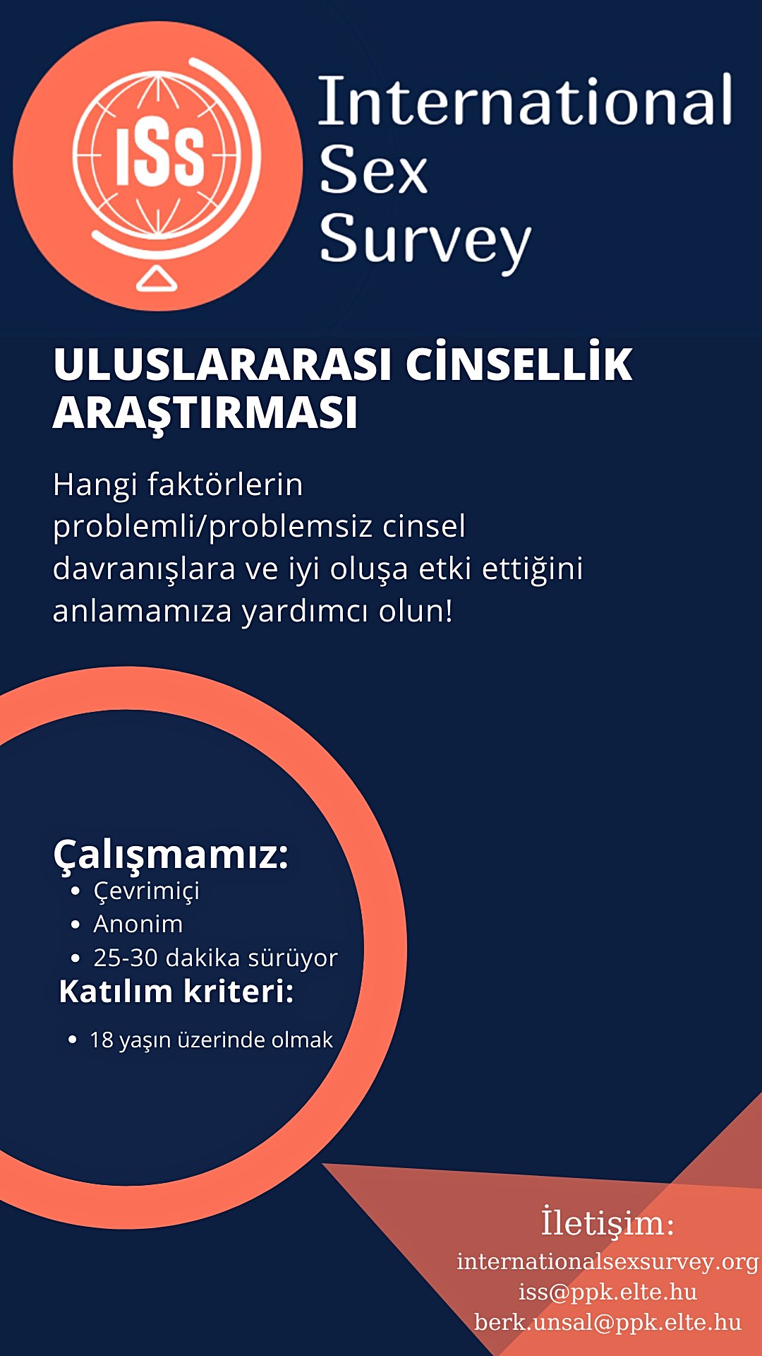 Bu sorulara ve daha fazlasına yanıt aradığımız çalışmamıza katılmak ister misiniz? Kanada, Amerika Birleşik Devletleri ve Macaristan merkezli, uluslararası işbirliği olan, 45 ülkenin katıldığı ve hem olumlu hem de olumsuz cinsel davranışları inceleyen, kültürlerarası ve tamamen çevrimiçi ve anonim araştırmamıza katılmak için: https://bit.ly/ISS-TUR-TU
