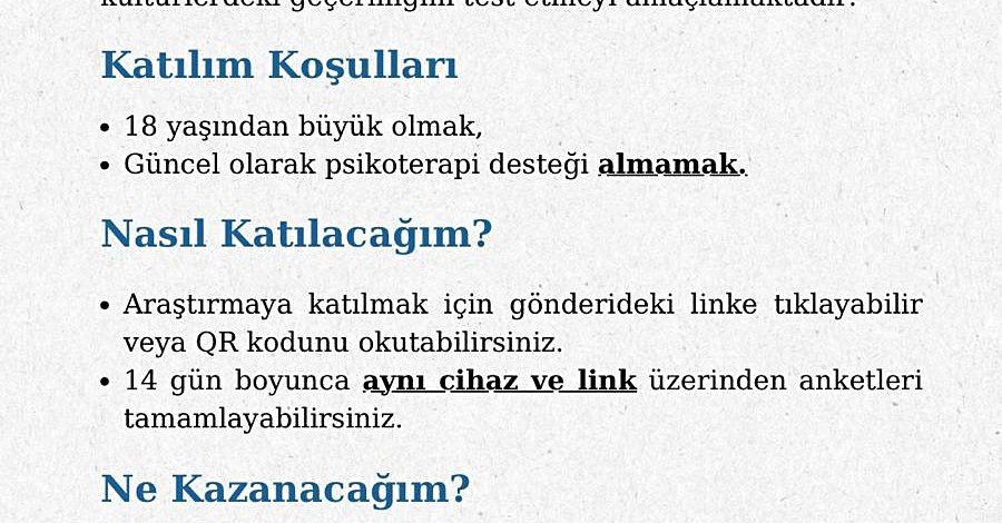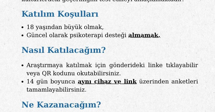 Eğer güncel olarak psikoterapi desteği almıyorsanız linki doldurarak çalışmamıza katkıda bulunmanızı rica ederiz.