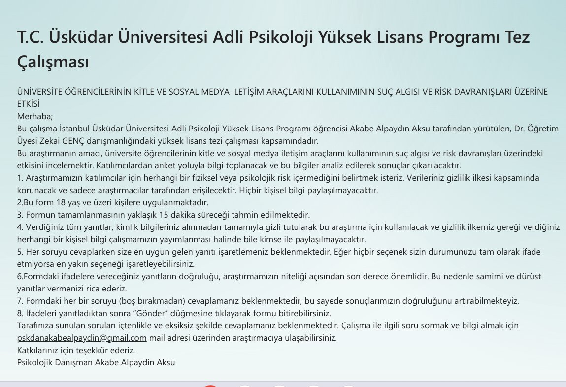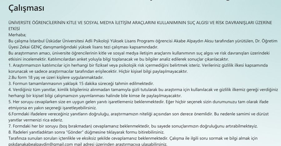 Merhaba Arkadaşlar, Üsküdar Üniversitesi Bağımlılık ve Adli Bilimler Enstitüsü Adli Psikoloji alanında yüksek lisans yapmaktayım ve tez aşamasına geldim. Bu süreçte sizlerin desteğine ihtiyacım var! Tez çalışmam için hazırladığım kısa bir anket var ve birkaç dakikanızı ayırarak doldurmanız benim için değerli. Anket, üniversite öğrencilerinin görüşlerine dayalı bir çalışma olduğu için sizlerin katılımı çok önemli. Destekleriniz için şimdiden çok teşekkür ederim! Sevgiler, Akabe Alpaydin Aksu