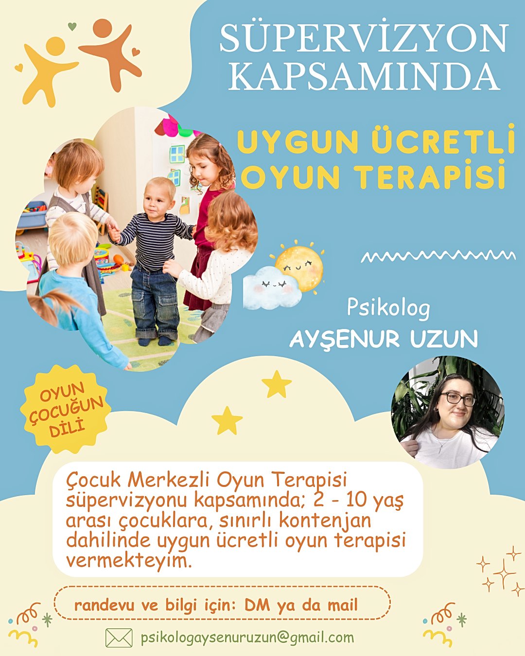 Merhabalar, 2-10 yaş arası çocuklara süpervizyon kapsamında çocuk merkezli oyun terapisi ekolü ile çalışacağım. Eğitimimi Mehmet Teber'den aldım. İhtiyacı olan çocuklar için yönlendirme yapabilirsiniz. Uygun ücretli olacaktır. İletişim için [email protected] mail adresim üzerinden ya da psikologaysenuruzun instagram sayfamdan ulaşabilirsiniz.