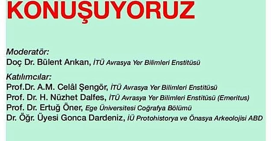 Yerbilimleri, Arkeoloji ve Antropoloji Ekseninde Jeoantropoloji söyleşisi Prof. Dr. Celal Şengör (İTÜ AYBE), Prof. Dr. Nüzhet DALFES (İTÜ AYBE), Prof. Dr. Ertuğ ÖNER (Ege Üniversitesi Edebiyat Fakültesi Coğrafya Bölümü) ve Dr. Gonca DARDENİZ (İÜ Protohistorya ve Önssya Arkeolojisi ABD)