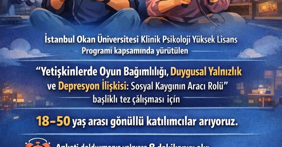 “Yetişkinlerde Oyun Bağımlılığı, Duygusal Yalnızlık ve Depresyon İlişkisi: Sosyal Kaygının Aracı Rolü” başlıklı tez çalışması için