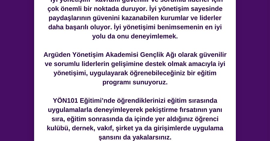Argüden Yönetişim Akademisi Gençlik Ağı olarak güvenilir ve sorumlu liderlerin gelişimine destek olmak amacıyla iyi yönetişimi, uygulayarak öğrenebileceğiniz bir eğitim programı sunuyoruz.