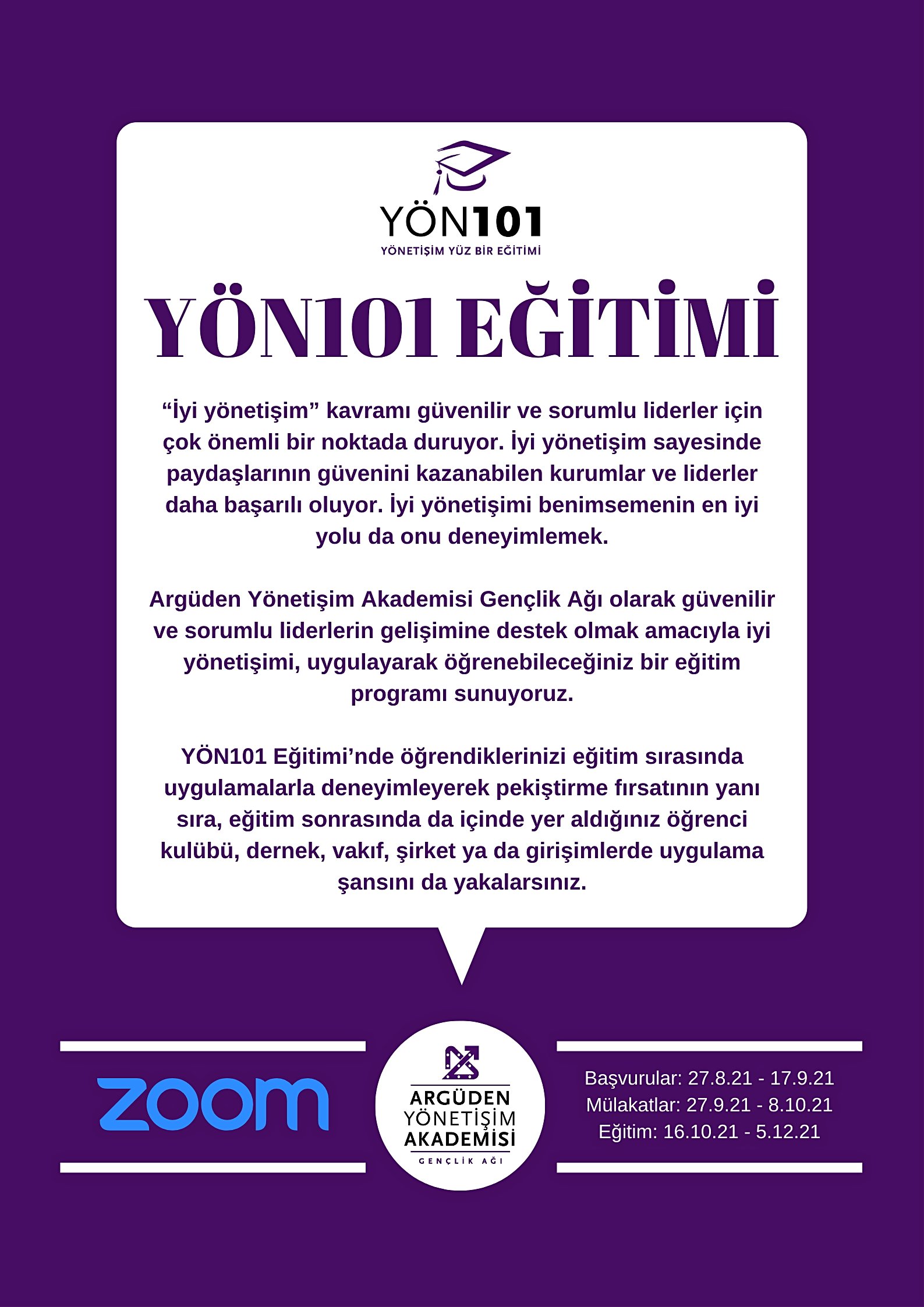 YÖN101 Eğitimi’nde öğrendiklerinizi eğitim sırasında uygulamalarla deneyimleyerek pekiştirme fırsatının yanı sıra, eğitim sonrasında da içinde yer aldığınız öğrenci kulübü, dernek, vakıf, şirket ya da girişimlerde uygulama şansını da yakalarsınız.