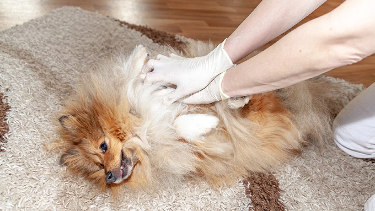 - Kedi veya küçük köpeğinizi düz bir zemine, sağ tarafı yere bakacak şekilde yatırın.