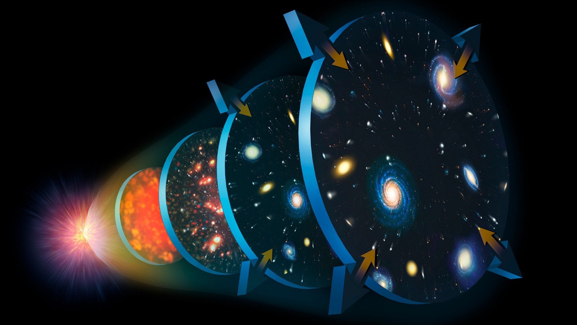 Bugün Evren'de uzak bir galaksiden gelen ışık, Evren genişlediği için kırmızıya kaymaktadır. Genişleme hızı geçmişte daha büyük olduğundan, daha uzaktaki cisimler, genişleme hızının gözlem ötesi tahminlerinin göstereceğinden çok daha hızlı bir şekilde uzaklaşıyor gibi görünüyor: Bunun nedeni, Evren'imizin sadece madde ve radyasyonu değil, karanlık enerjiyi de içermesidir. Genişleme hızının zaman içinde değişme şekli, Evren'in neyden oluştuğu tarafından belirlenir. Büyük Patlama'dan sonraki ilk birkaç bin yıl boyunca Evren'e en çok radyasyon hakim olmuştu. Bundan milyarlarca yıl sonra, onun yerini madde aldı. Günümüzde ise maddenin yerini, karanlık enerji almış durumda. Fakat Büyük Patlama'dan önce uzay, katlanan (üssel) bir hızla genişledi, bu da Evren'i düz bir şekilde gerdi ve ona her yerde sabit özellikler verdi. Tüm bunlar, kozmik enflasyon döneminde oldu.