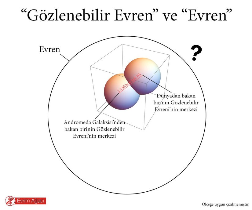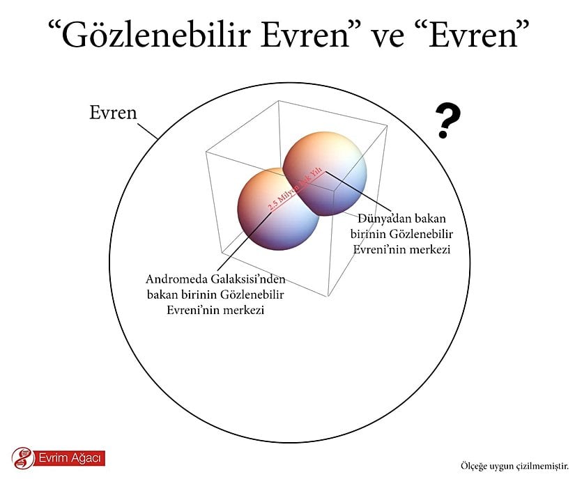 - Gözlenebilir Evren, ışığın bize ulaşabildiği 13,82 milyar yıl ışık yılı mesafesindeki küre olup, gerçek çapı evrenin genişlemesi nedeniyle yaklaşık 93 milyar ışık yılıdır.
