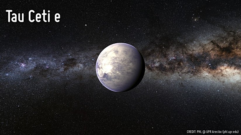 Balina takımyıldızında bulunan ve Güneş’e neredeyse tıpatıp benzeyen Tau Ceti etrafında 168 günde bir dolanan bu gezegen Dünya’nın 4.3 katı kütleye sahip ve yüzey sıcaklığı 68 °C ancak gezegenin sabit bir eğimle yıldıza bağlı olduğu ve sera etkisiyle sıcaklığın çok daha yukarılara çıkabileceği düşünülüyor. Ayrıca Güneş sistemimizde bulunanın 10 katı büyüklüğünde bir asteroit kuşağına sahip olması gezegeni muazzam meteor yağmurlarına maruz bırakıyor olabilir. %74 Dünya benzerliği(ESI) bulunan Tau Ceti e kendisi bulundurmasa bile kendi aylarında yaşam bulundurma olasılığı yüksek bir gezegen.