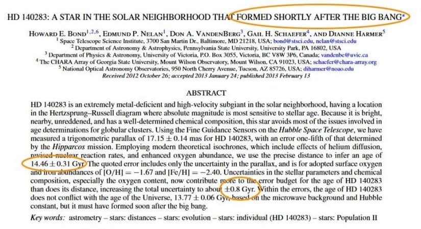İkinci olarak bahsi geçen Methuselah yıldızının (ya da katalog adıyla HD140283'ün), yaşıyla ilgili hesaplara baktığımızda şunu görüyoruz: 2013'te yayınlanan makalenin özet kısmında yıldızın yaşından 14.46±0.31 milyar yıl olarak bahsedilmiş! Fakat olay bununla bitmiyor, yazı devam ediyor ve özetle şunu diyor: