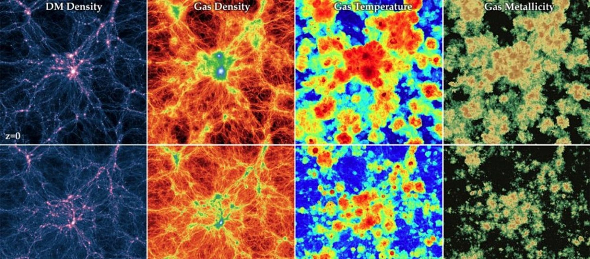 Evren, akıl almaz büyüklükteki bir yapıdır. Bugüne kadar bu yapının ne kadar büyük, uçsuz bucaksız ve karmaşık olduğuna dair birçok farklı açıdan yaklaşıp, birçok perspektif sunduk. Ancak buna rağmen modern kozmolojinin ve bilimin bu yapıyı modern bilgisayarları kullanarak simülasyon üzerinde yeniden yaratabiliyor olması birçoklarına şaşırtıcı gelebilecektir. Öyle ki, kozmologlar son 20 yıldır bilgisayarlı Evren modellemeleri yapabilmektedirler. Görselde, bunu başarmamızı sağlayan en meşhur algoritmalardan biri olan Hareketli Ağ Algoritması ile elde ettiğimiz bir Evren modeli gösterilmektedir. Modelde, simüle edilmiş evrenin karanlık madde yoğunluğu, gaz yoğunluğu, gaz sıcaklığı ve gaz metalisitesi gibi fiziksel parametreleri, farklı kırmızıya kayma değerlerine bağlı olarak, yani evrenin evriminin farklı evrelerinde nasıl göründüğü gösterilmektedir. Görseldeki her bir kutucuğun bir kenarı 100 megaparseğe, yani 3.086x1021 (3.086.000.000.000.000.000.000 veya 3.1 sekstilyon) kilometreye karşılık gelmektedir.