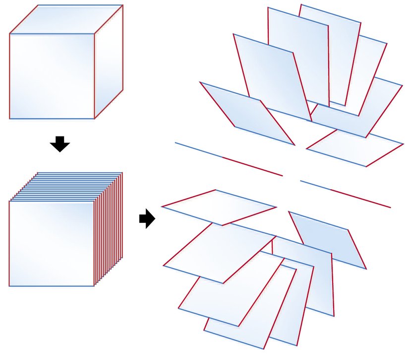 3-torusun bir başka ilginç özelliği, daha önce keşfedilen iki boyutlu torus ile ilişkisidir. Küpü küçük dikey dilimler halinde kesersek, bir dizi kare elde ederiz. Bu karelerin karşılıklı kenarları birbirine yapıştırılır; çünkü bu kenarlar küpün zıt yüzlerini oluşturur. 3-torus, süreğen bir Rolodex, yani 2-toruslardan oluşan bir çember gibidir. Ön ve arka karenin bağlantılı olduğunu unutmayın, onlar aslında küpün yüzleriydi. Topologlar, bu manifoldu T2×S1T^2\times S^1 şeklinde belirtir: Burada T2T^2, 2 torus'u, S1S^1 ise daireyi belirtir. Bu, bir toruslardan oluşan bir torus demeti örneğidir.