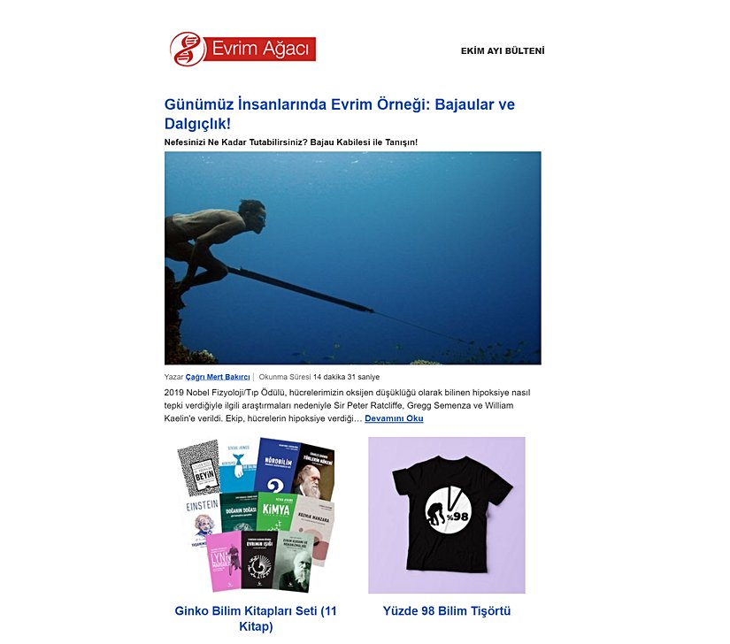 E-posta, halen insanlara erişmenin en önemli yöntemlerinden birisi ve biz, bu sene ilk defa devreye soktuğumuz e-posta bültenimizle, editörlerimizin kendi elleriyle seçtikleri seçki içerikleri üyelerimizle buluşturmaya başladık. Eğer tamamen ücretsiz olan bültenlerimizi almak istiyorsanız, aktif bir Evrim Ağacı üyeliğiniz olduğundan emin olmanızı tavsiye ederiz.