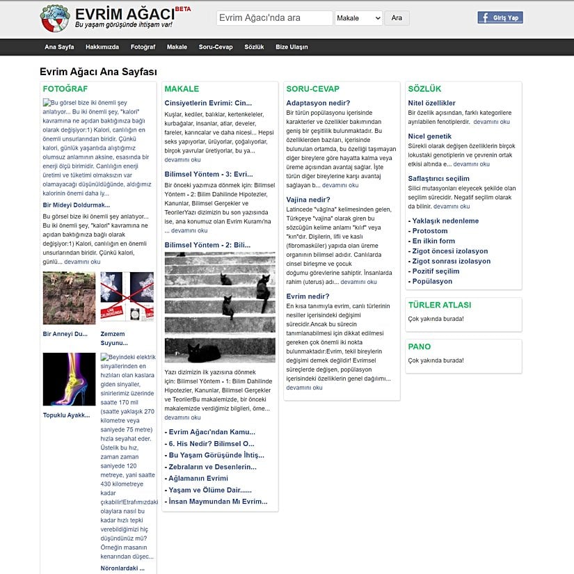 Evrim Ağacı internet sitesinin Beta Sürümü yayına girdi. Sosyal medyanın hızla yükselişe geçmesine bağlı olarak, Facebook'un kısıtlandırıcı ve reklam satışına yönelik politikaları günden güne belirginleşmeye başladı. Örneğin o dönemde FBML isimli özel Facebook kodlarını bir anda sonlandırarak, 391 makaleyle zar zor inşa ettiğimiz ve en çok ziyaret edilen Makale Arşivi'mizin yok olmasına neden oldular ve günlerce çalışarak yeniden inşa etmemiz gerekti. Bu nedenle artık sadece Facebook ile kısıtlı kalmak istemeyerek, makale ve içeriklerimizi sitemize taşımaya başlama kararı aldık. Bu siteyle birlikte "makale" (uzun, popüler bilim makaleleri), "soru-cevap" (büyük makalelerin kısa özet halleri), "fotoğraf" (kısa bilgi içerikleri), "sözlük" gibi girdilerimiz arasındaki farklar belirginleşmeye başladı. O dönemki açıklamada, şu mesaj ile günümüzdeki sistemimizi duyurmuştuk: