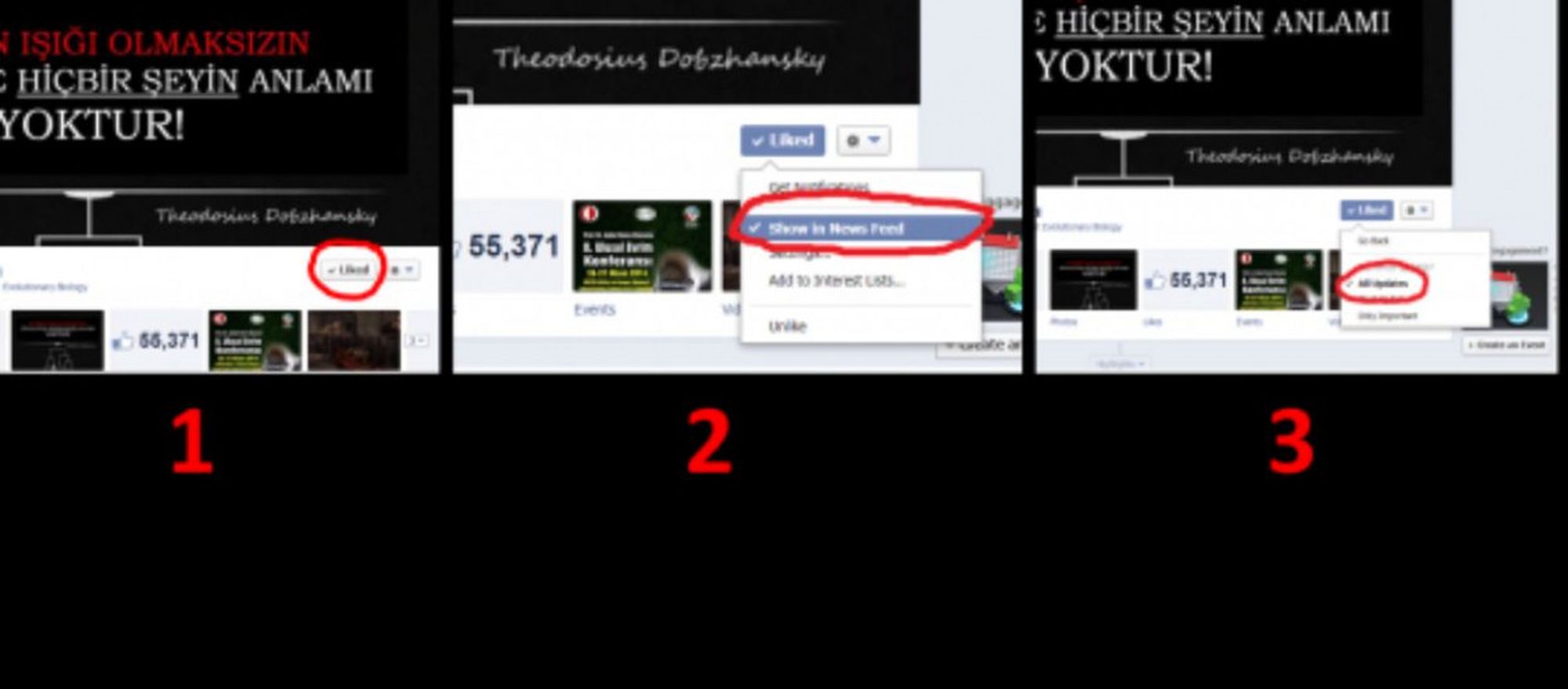 Facebook, sayfa gönderilerinin kişiler tarafından görülmesini giderek sınırlandırıyor. Son düzenlemelere göre Evrim Ağacı’nın tüm paylaşımlarının sayfanızda çıkması için (her paylaşımda size bildirim gelmeyecektir, sadece Haber Kaynağı’nda görülecektir) bu adımları uygulayınız: