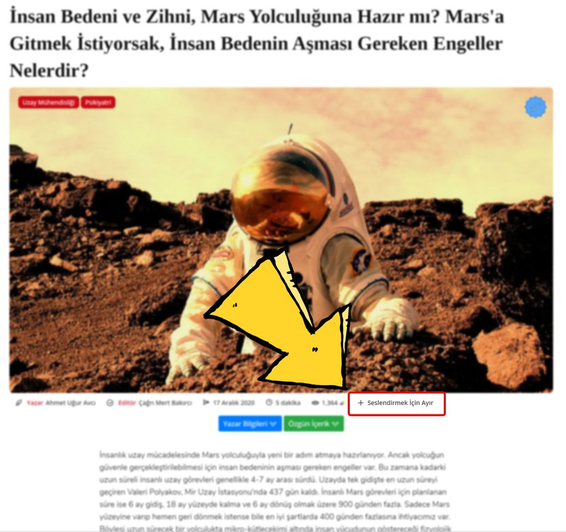 Aralık 2020 itibariyle Apple Podcasts Türkçe bilim kategorisinde en çok dinlenen oynatma listelerinde ilk 2 sıraya girecek düzeyde artan ilgiyi doğru yönlendirebilmek adına, henüz seslendirilmemiş bütün içeriklerimizin altına "Seslendirmek İçin Ayır" butonu ekledik! Örneği aşağıdaki görselde görebilirsiniz.