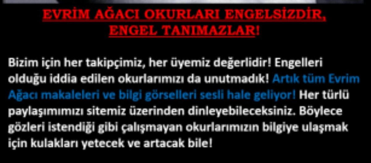 Bizim için her takipçimiz, her üyemiz değerlidir! Engelleri olduğu iddia edilen okurlarımızı da unutmadık! Artık tüm Evrim Ağacı makaleleri ve bilgi görselleri sesli hale geliyor! Her türlü paylaşımımızı sitemiz üzerinden dinleyebileceksiniz. Böylece gözleri istendiği gibi çalışmayan okurlarımızın bilgiye ulaşmak için kulakları yetecek ve artacak bile!