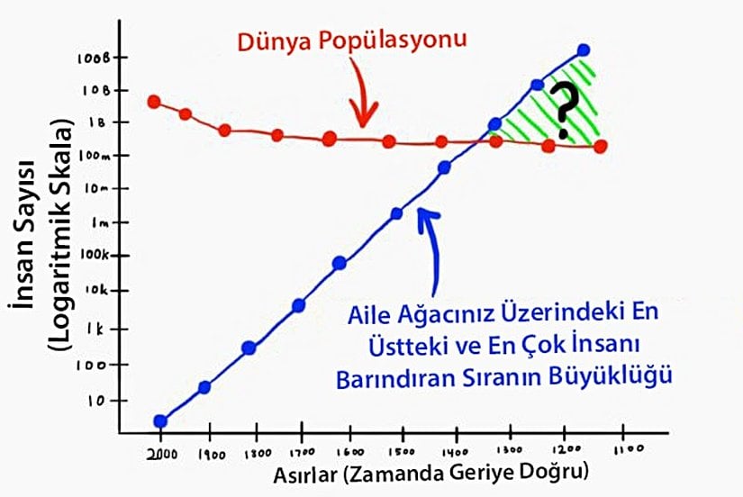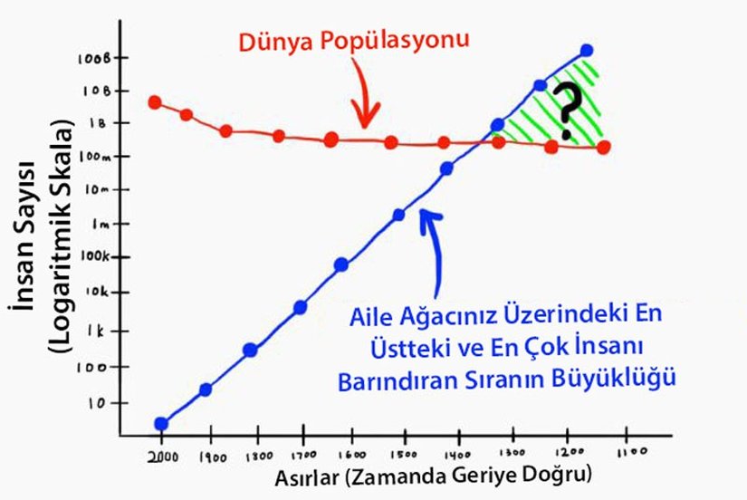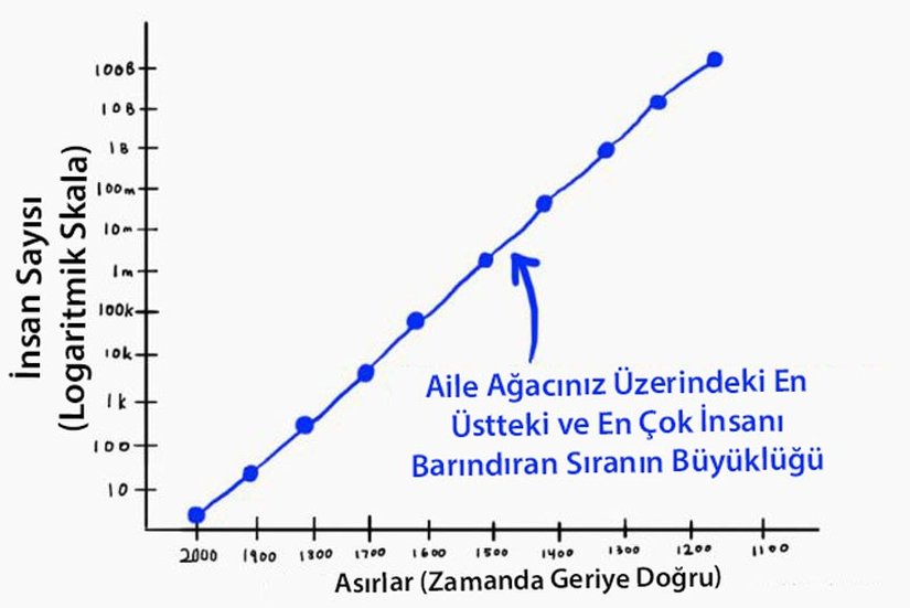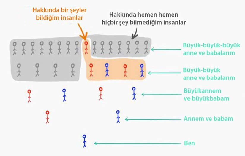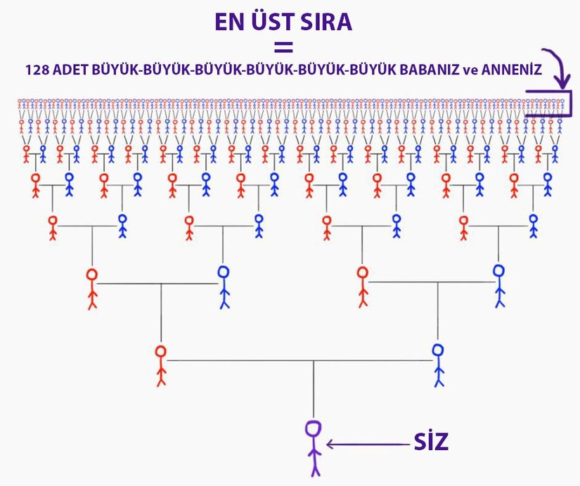 12 nesil geriden bahsederken kimlerden söz ettiğimizin farkında mısınız? Büyük büyük büyük büyük büyük büyük büyük büyük büyük büyük büyük ebeveynlerinizden! Ya da büyük büyük ana-babanızın, büyük büyük ana-babalarının, büyük büyük ana-babalarının, büyük büyük ana-babalarından! Evet, bu iş tamamen kontrolden çıktı. Bu sayılar, bir öncekinden sadece 5 nesil daha geriye gidiyor ve şu çılgınlığa bir bakın!