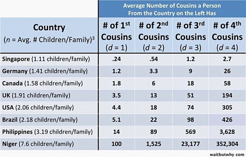 Benim en çok ilgimi çeken nokta şu oldu: Bu sayılar o kadar katlanıyor ki, eğer üreme kültürler ve milletler arasında eşit miktarda karışsaydı aile başına çocuk sayısının dünya ortalamasını (2,36) alarak bu formülü, dünyada sahip olduğunuz en uzak akrabanın on beşinci dereceden bir kuzen olacağını hesaplamak için kullanabilirdiniz.