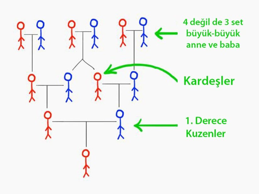 (Bütün bu kuzen çocuğu/kuzen torunu olma meselesi farklı nesillerde olmakla ilgilidir – bu yüzden sizin ikinci derece kuzeninizin çocuğu size bir derece uzak kuzen oluyor, çünkü sizden bir nesil uzaklıkta. Dedenizin birinci dereceden kuzeni de size iki derece uzak kuzen oluyor. Direkt iki, üç ya da dördüncü dereceden kuzeniniz sizinle aynı nesilde olmak zorundadır.)