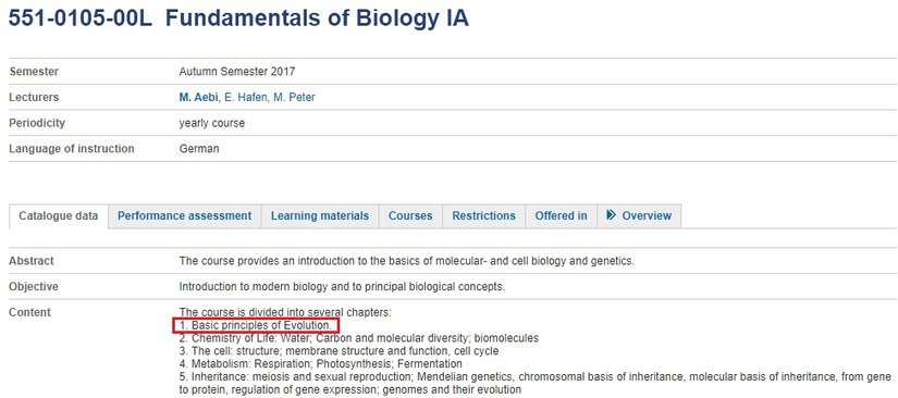 Yukarıda görüldüğü üzere (açıklama Almanca, fakat ders isimleri İngilizce verilmiş.) biyoloji lisans programında öğrencilere, başlangıç dersi olarak verilen 2 derste (Introductory Lecture in Biology I & II), antropoloji, ekoloji, botanik veya genetik gibi biyolojinin alt dalları ayrıntılı bir şekilde tanıtılıyor, aynı şekilde lisans öğrenimlerinin ilk dönemindeki zorunlu modüllere dahil olarak konan "Evrim" dersinde (BIO 6 Evolution) haftada 3 saat 15 dakika süren oldukça ayrıntılı bir şekilde evrim öğretiliyor.