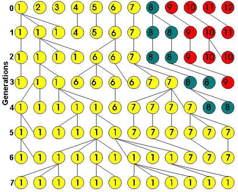 Şimdi sizlere hayali bir durumu anlatarak Genetik Sürüklenme'yi açıklamak istiyoruz. Aşağıdaki fotoğrafta, 12 farklı gen (veya alel) sıralanmıştır. Aynı zamanda, yukarıdan aşağıya, birbirini takip eden nesiller belirtilmiştir. Bütün bu genlerin eşit derecede fit olduğunu düşünelim; yani Doğal Seçilim'in etkisini sıfırlayalım. Bu genler, artık nötrdür (Moleküler Evrim'in Nötral Teorisi, bunun üzerine kuruludur). Genlerin farklı renkleri ise, genlerin genetik olarak ayırt edilebilir bir özelliğini temsil ediyor olsun; yani her bir genin etkisi, renk koduyla belirtilmiştir: