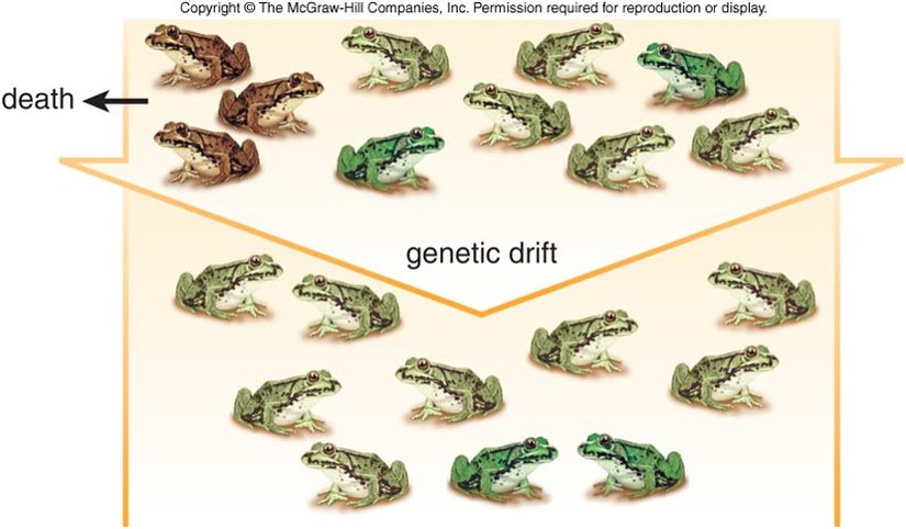 Burada üstte gösterilen popülasyon, kurbağaların çevreleriyle dengede olduğu bir anı yansıtmaktadır. Bu zaman dilimi içerisinde, birçok farklı renkte kurbağa bir arada yaşamaktadır. Genel olarak yeşiller sayıca fazladır; ancak kahverengi olanlar da az sayıda da olsa varlıklarını sürdürebilmektedirler. Ne var ki, bu ufak kurbağa popülasyonunun yaşadığı bölgeye yol yapmak amacıyla giren inşaat ekibi veya meydana gelen bir doğal felaket, kurbağaların bazılarının rastgele, evrimsel uyum başarılarından bağımsız olarak ölmelerine neden olabilir. Diyelim ki bu örnekte kahverengiler şanssızlardı ve ölen bu 3 kurbağa oldu. Bu durumda, geriye kalan daha ufak popülasyon, yeniden ürediğinde ve çoğaldığında, sadece yeşillerden oluşan bir popülasyon oluşacaktır. Kahverengi olma özelliği, bu popülasyon için, seçilim baskısından tamamen bağımsız olarak elenmiştir. Zira kahverengi kurbağalar avcıları ya da uyumsuzlukları nedeniyle değil, şanssızlıkları nedeniyle elenmişlerdir.