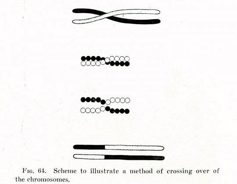 Daha fazla uzatmadan devam edelim. Crossing-over olayı ilk defa 1909 yılında Frans Alfons Janssens tarafından gözlenmiş ve "kiyazmatip" olarak isimlendirilmiştir. Ancak sonradan, 1916 yılında, ünlü Amerikalı Evrimsel Biyolog Thomas Hunt Morgan tarafından ayrıntıları da ortaya çıkarılmış, deneysel olarak gösterilmiş ve Evrim Teorisi'nin Bir Eleştirisi (A Critique of the Theory of Evolution) isimli makalesinde "crossing-over" olayını izah etmiştir. Günümüzde kiyazma (chiasma), crossing-over olayı sırasında değiştirilen genlerin birbirine dokunduğu bölge olarak anılmaktadır. Aşağıdaki görsel, Morgan'ın crossing-over'ı anlatmak için kullandığı figürdür:
