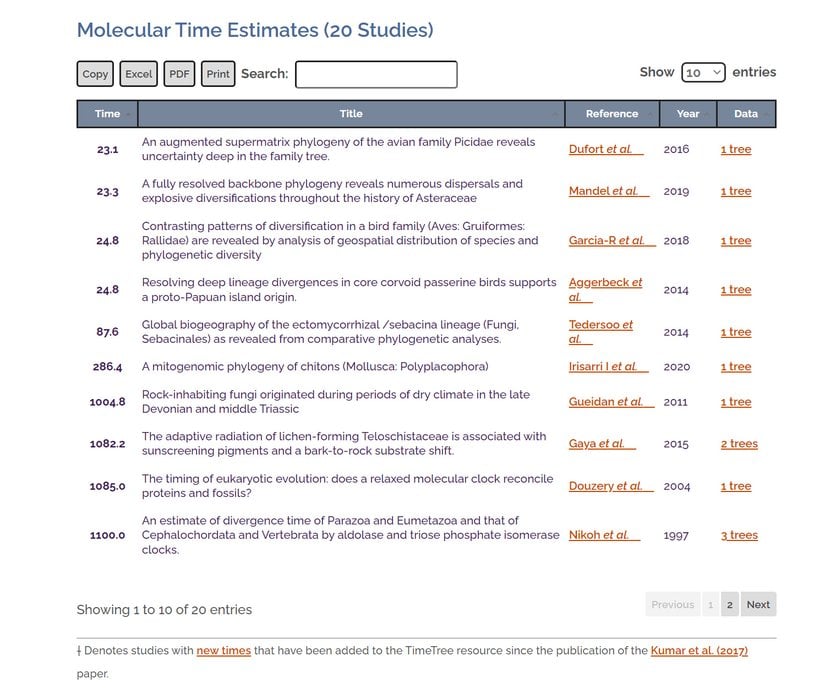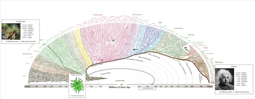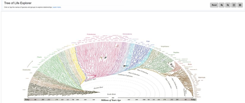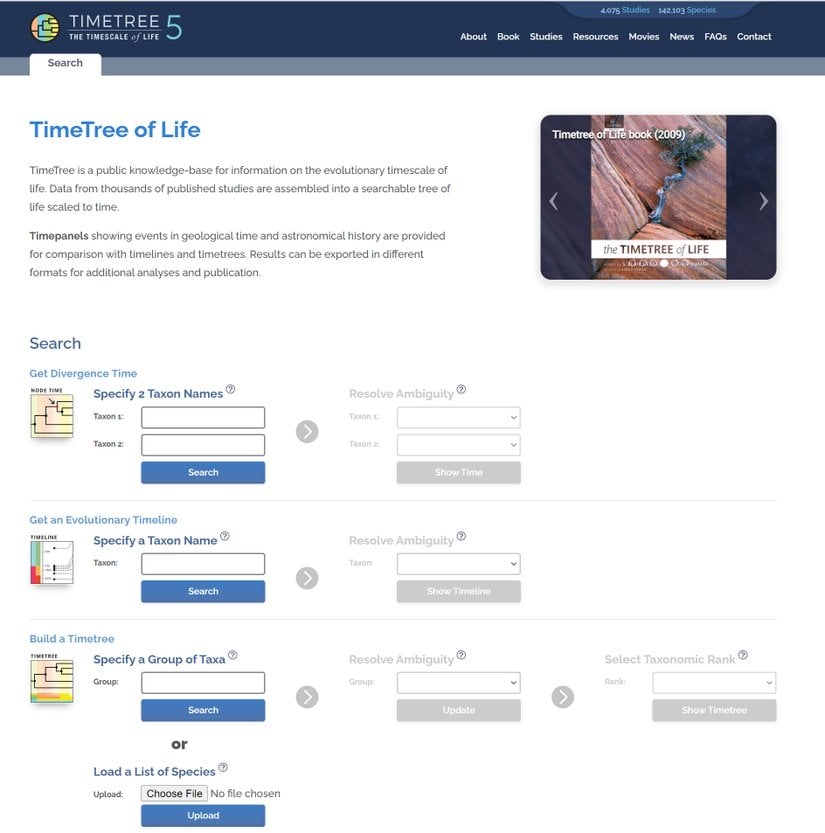 Temple Üniversitesi tarafından sürdürülen TimeTree projesi, 2 türün ortak atasının ne zaman yaşadığını veya bir türün evrimsel geçmişinin ne olduğunu görebilmeniz için tasarlanmış, David Attenborough'nun Emmy Ödüllü belgeseli Rise of Animals'da da gösterilmiş olan, harika bir internet sitesi.