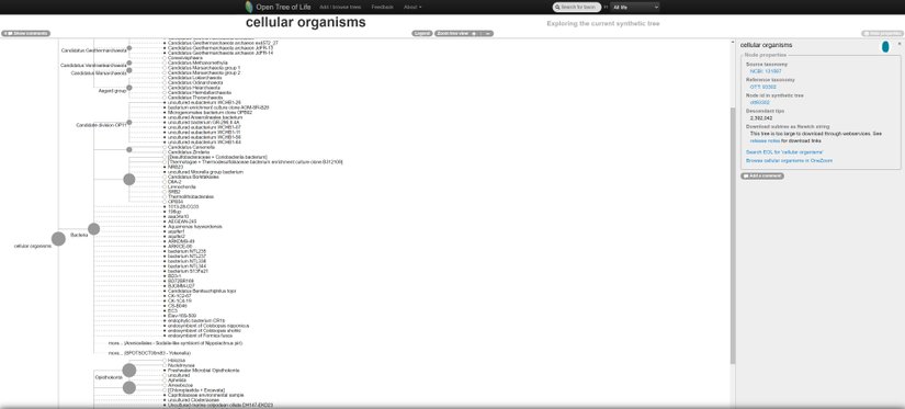 Open Tree of LifeNe yazık ki Lifemap gibi oldukça kısıtlı miktarda bilgiye sahip olan sitede, daha ziyade güncel taksonomiyi takip etmek mümkün. Ayrıca arayüzü de diğerleri kadar ilgi çekici ve basit değil.