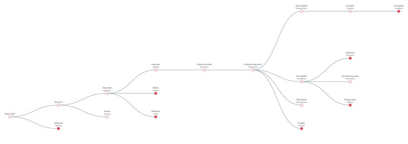 OneZoomAyrıca sağ üst kısımda "Advanced Search" (Gelişmiş Arama) kısmını açarak, 2 ayrı taksonu girmeniz hâlinde bunların ayrışma yerini ve her birine giden dalları görmeniz mümkün (örnek):