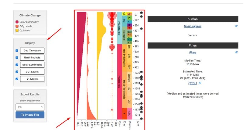 TimetreeAyrıca bu ayrışma süresince geçen jeolojik zaman skalası, Dünya'ya çarpan göktaşları, Güneş parlaklığının değişimi, CO2 ve O2 değerleri de bu grafikte gösterilmektedir (en sağdaki noktalar, yukarıdaki makalelerin tahmin ettiği ayrışma süresini ayrı ayrı göstermektedir; noktalara tıklayarak makalelere de inebilirsiniz):