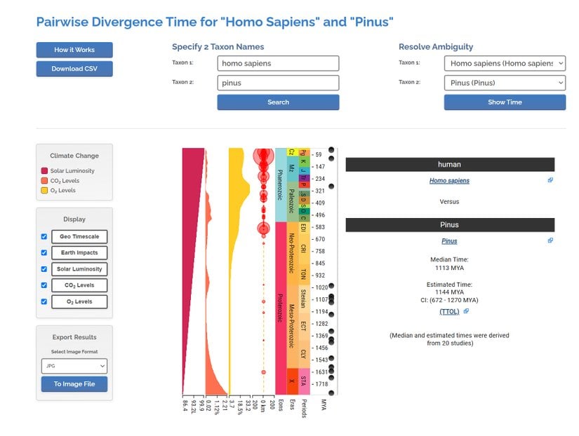 TimeTreeÖrneğin "Get Divergence Time" (Ayrışma Zamanını Öğren) kısmındaki Taxon 1'e insan (Homo sapiens), Taxon 2'ye Çam Ağaçları (Pinus) girecek olursanız, böyle bir sonuç veriyor: