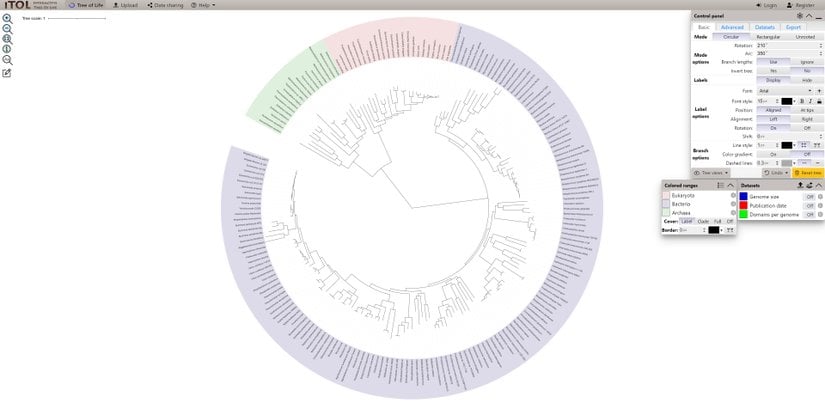 Biraz daha akademik ve üst düzey bir araç olan iTOL, dairesel bir evrim ağacı modelini takip ediyor:
