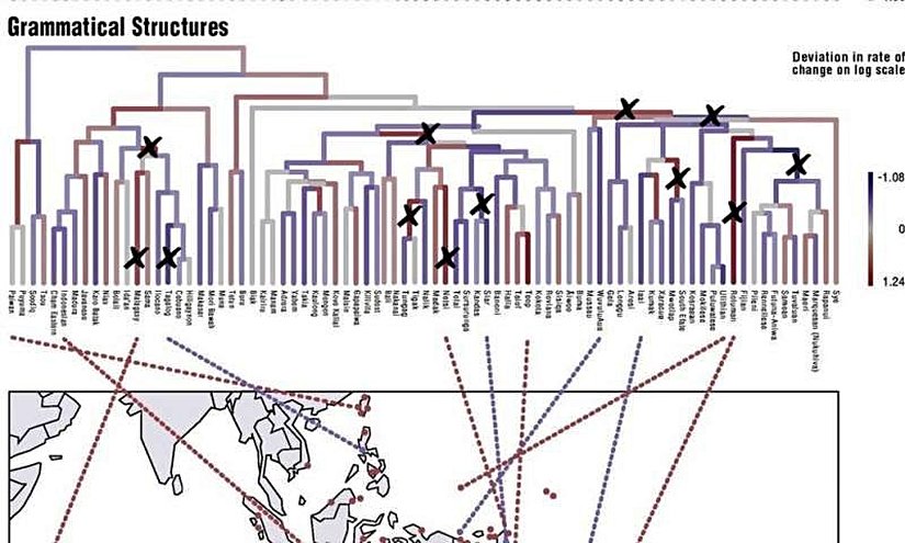 - Avustronezya dil ailesi üzerinde yapılan hesaplamalı modelleme, kelimelerin ve gramerin farklı hızlarda ve biçimlerde evrimleştiğini, kelimelerdeki değişimlerin genellikle daha ani olduğunu ortaya koymuştur.