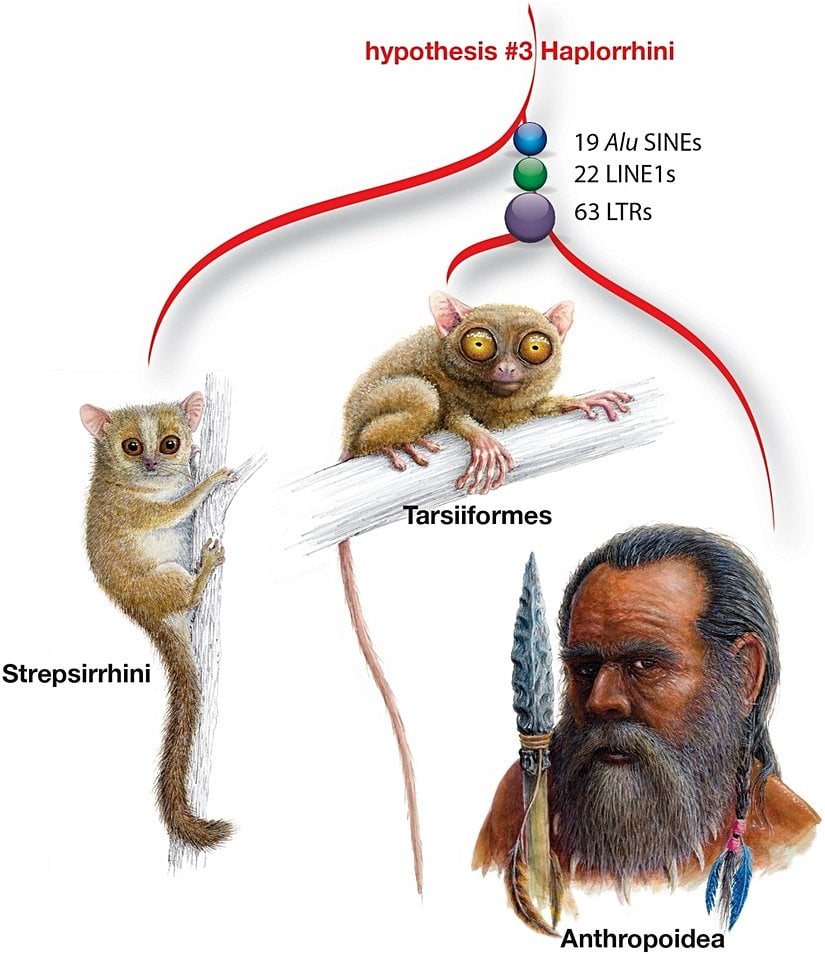 Primat evrimine, dolayısıyla biz insanların primat kökenlerine yönelik en fazla tartışılan konulardan bir tanesi Güneydoğu Asya tarsiyerinin filogenetik konumudur. Her ne kadar birçok moleküler veri, ön maymun hipotezi çerçevesinde tarsiyerlerin primatların evrim ağacında ıslak burunlu maymunların (Strepsirrhini) en yakın akrabası olduğunu gösterse de, 'önce tersiyer hipotezi' çerçevesinde bu canlının soy hattının primatlardan daha önceden ayrıldığını gösteren veriler de bulunmaktadır. Üstelik, Haplorrhini hipotezi çerçevesinde, kuru burunlu, insana yakın maymunlarla yakın akrabalığı olduğunu gösteren veriler de elde edilmiştir. Tarsius genomuna gömülmüş halde bulunan retrotranspozon eklentileri, çiftli genom dizilemesi yöntemi aracılığıyla bu 3 hipotezi de bir arada test edebilmemize imkan vermiştir. Milyonlarca retrotranspozon arasından, tarsiyerlerde ve insansı maymunlara benzeyen kuru burunlu maymunlarda (anthropoid) 104 kusursuz ortolog ekleme bulunmaktadır ve bunlar, ıslak burunlu maymunlarda bulunmaz. Bu durum, Happlorhini hipotezini, çelişkiye yer bırakmaksızın doğrulamaktadır ve diğer iki olasılığa hiçbir olasılık bırakmamaktadır. Dolayısıyla tarsiyerlerin, Haplorrhini kladı içerisindeki antropoidlerin kardeş grubu olduğu açık bir şekilde görülmektedir.
