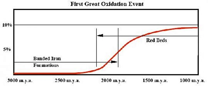 2.500 MYÖ: Büyük Oksitlenme Olayı olarak jeoloji tarihine geçen olay, siyanobakterilerin sayısının aşırı artmasıyla bu dönemde başlamıştır. Bantlı demir oluşumları bu dönemde meydana gelmiştir. Aşağıdaki grafikte, oksijen seviyelerinin bu dönemdeki artışı gösterilmektedir.