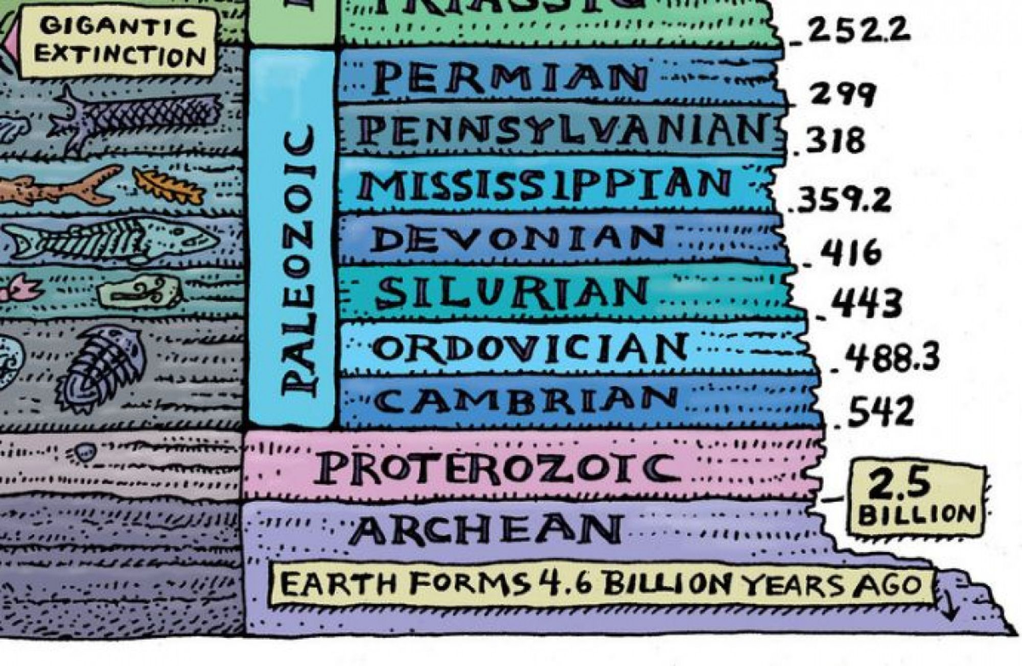 542 MYÖ: "Kambriyen Patlaması" olarak bilinen bu dönem, aslında bilimsel anlamda sadece bir geçişi ifade etmekle birlikte, kimi kitle tarafından çarpıtılarak lanse edilmektedir. Bu konudaki ilgili yazımızı okuyabilirsiniz. Kısaca açıklamak gerekirse, bu dönemde canlıların fosillerindeki çeşitlilik ciddi miktarda bir artış göstermiş ve artık oldukça karmaşık bir ekosisteme ulaşılmıştır. Güncel analizler, bu hızlı çeşitlenme döneminin o kadar da anormal ya da şaşılacak bir olgu olmadığını göstermektedir.