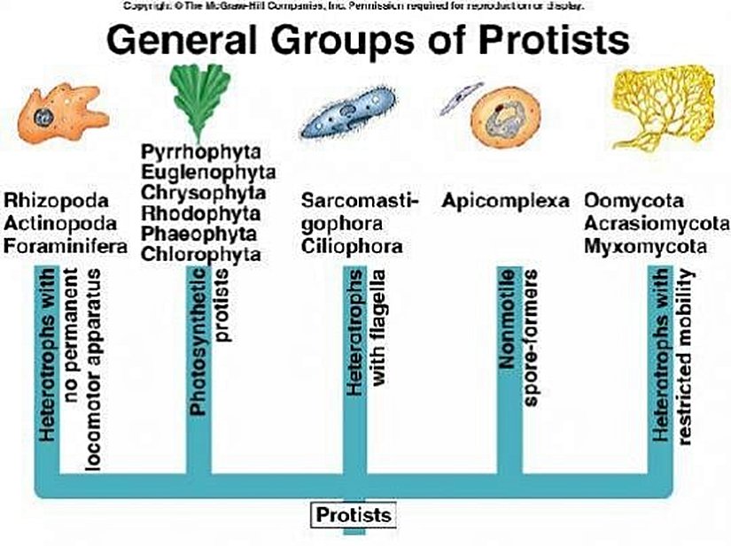 Protistaların evrimi, bahsettiğimiz gibi yaklaşık 750 milyon yıl öncesindeki ilkin türlerden ve prokaryotlardan başlar; ancak Kambriyen Dönem'in başlarına kadar büyük bir hızla dallanır. Bu dallanmanın birçok canlı grubunun evriminde rol oynadığı düşünülmektedir. Bu sebeple protistaların özelliklerine ve tiplerine bakmak, onların çeşitliliğini ve evrimini anlamak açısından faydalı olacaktır: