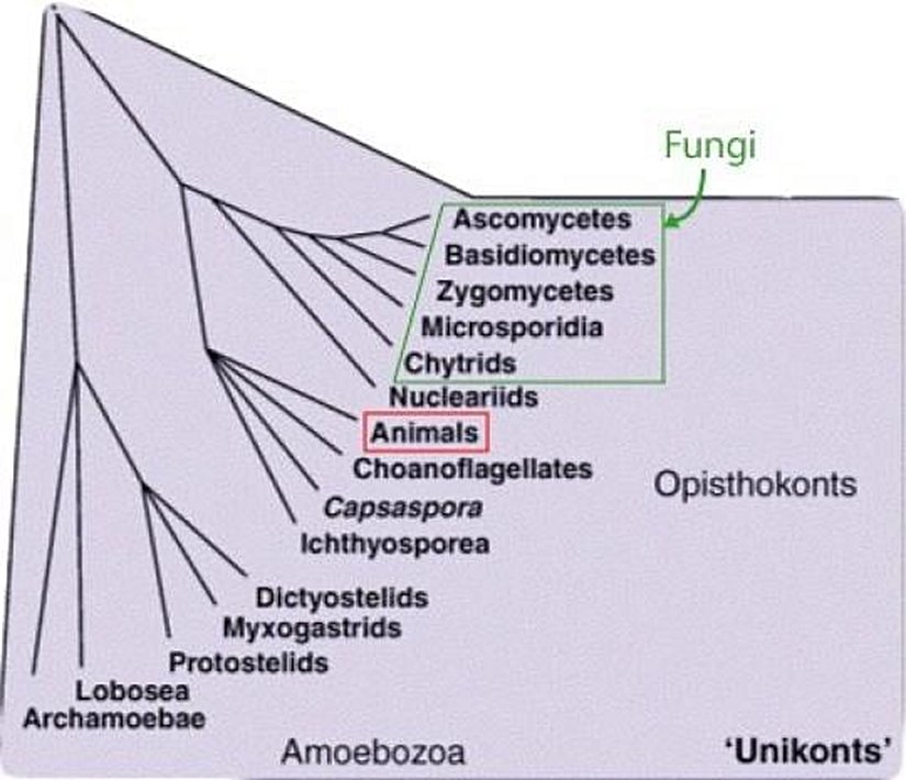 Bu atasal ve torunsal türlerin kamçı benzeri yapıları bulunduğunu ve evrimsel süreçte bu türün torunlarının kamçılarını özelleştirdiğine dikkat ediniz. Ancak bu türün içerisinden dallanarak, aşağıda gösterilen canlılara doğru evrimleşen mantarlarda kamçı yapısı yok olmuştur. Bu, belki de mantarların günümüzde sabit/hareketsiz canlılar olmasının en temel sebeplerinden biridir.