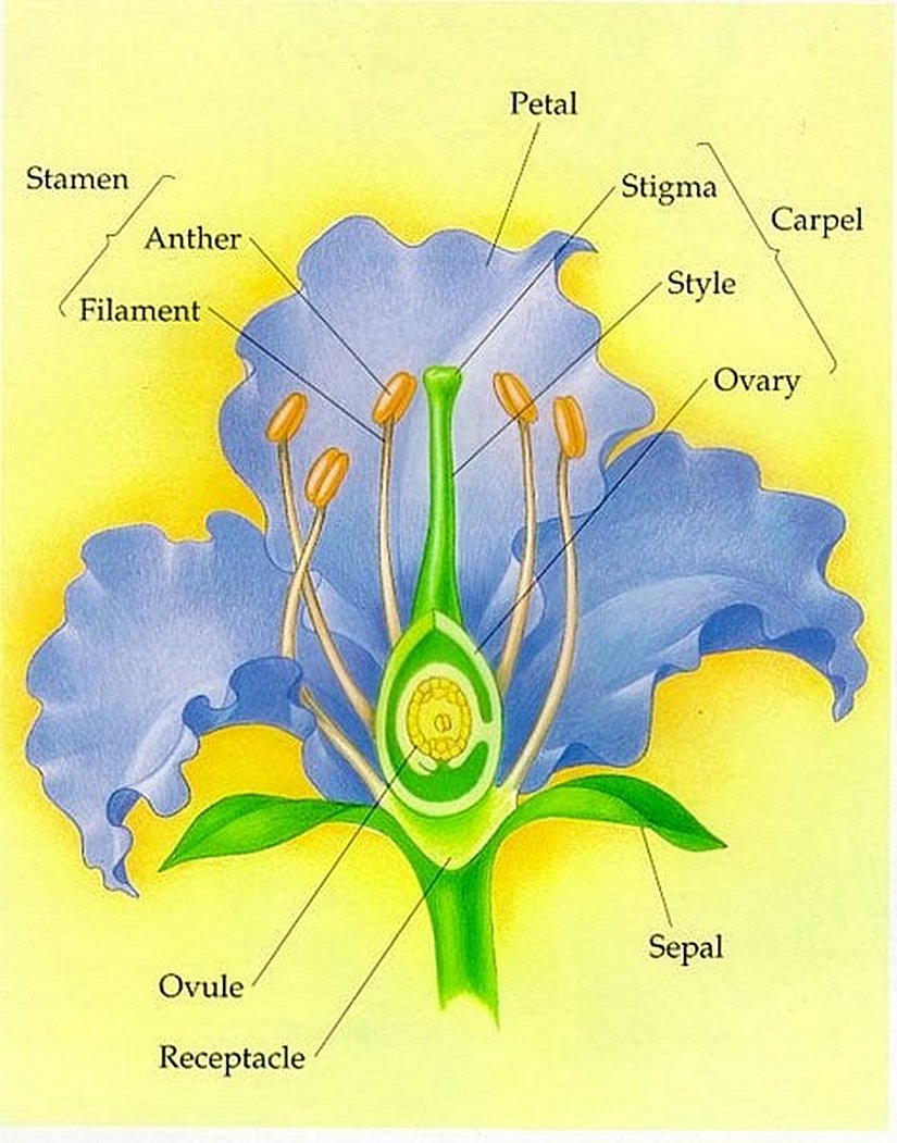 Kapalı tohumluların evrimleştirdiği ve en ayırt edici özellikleri olan çiçek yapılarının atasal formlarına Archaefructus isimli ve 3 türü bilinen bir cinsin keşfiyle rastlanmıştır. Bu sucul tohumlu bitkilerin 125 milyon yıl önce Jurasik Çağ'da evrimleşmeye başladığı düşünülmektedir. Çiçek yapısı, normalde 4 kısımdan oluşur: sepal, petal, karpel ve stamen. Bunların her birinin, şu anda detayıyla girmeyi gerekli görmediğimiz özellikleri ve görevleri vardır. Aşağıdaki fotoğraf, bu yapıların yer ve biçimlerini göstermektedir: