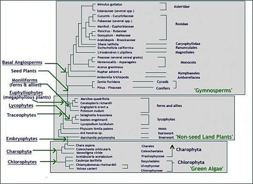 Yukarıda gören fotoğraf, günümüz yeşil bitkileri arasındaki evrimsel ilişkiyi bizlere göstermektedir. Aşağıdan yukarıya doğru bu gruplarn Türkçe isimlerine bakacak olursak:
