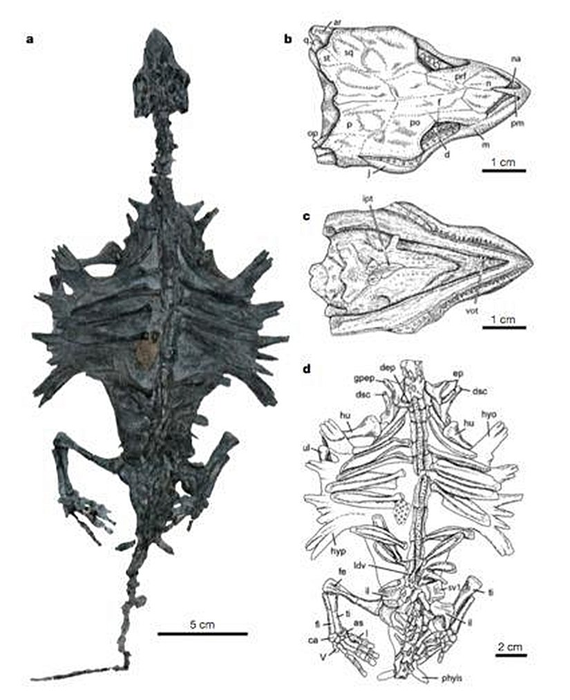 Triadobatrachus: Bu tür de, atası gibi kurbağalar ile semenderler arası bir geçiş göstermektedir. 250 milyon yıl önce yaşamıştır. Ancak bu tür, atasının aksine ilkin kurbağalara daha yakındır. Kısa bacakları vardır ve bu yüzden sıçrayamazlar. Günümüz kurbağalarındakinin aksine 14 omurları bulunur, modern kurbağalarda ise 9 tane vardır. Ve modern kurbağaların aksine tibia ve fibula kemikleri kaynaşarak tibuiofibula kemiğini oluşturmamıştır. Ancak kafatası yapısı oldukça kurbağaları andırmaktadır ve kemik yapısı onlar gibi ince hatlıdır.