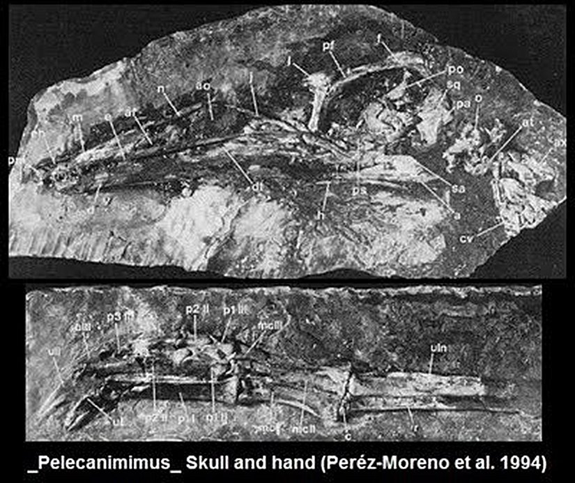 Pelecanimimus: Bilinen en eski ornitomimozordur. 130 milyon yıl önce yaşamıştır. Ornitomimozorlara geçiş türüdür çünkü bu türlerin dişleri yoktur, ancak Pelecanimimus'ta çok sayıda diş bulunur. 2-2,5 metre boyundadır. Kafatası sıra dışı şekilde uzundur ve genelde kafatası yüksekliğinin 4,5 katı kadardır. Ağzında toplamda 220 diş bulunur. Bu da onu sıra dışı bir geçiş türü yapmaktadır.
