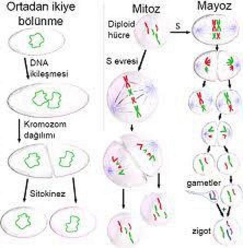 - Hücre içi iskelet (cytoskeleton) bulunmaz. Bu sebeple mitoz ile bölünemezler. Prokarya'nın bölünme biçimine amitoz bölünme (binary fission) denir. Bu işlem, mitoz ve mayoza göre son derece basittir: Temel olarak önce DNA eşlenir, sonra yaklaşık olarak hem sitoplazma, hem de genetik materyal iki yavru hücreye sırasıyla ve hemen hemen aynı anda paylaşılır. Mitozdaki fazların hiçbiri görülmez.