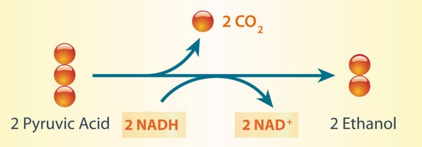 - İkinci adımda asetaldehit alkol dehidrojenaz kullanılarak etanole dönüştürülür ve bu süreçte NAD+ üretilir. Glikolize devam etmek için kullanılabilecek olan bu geri dönüştürülmüş NAD+'dır.